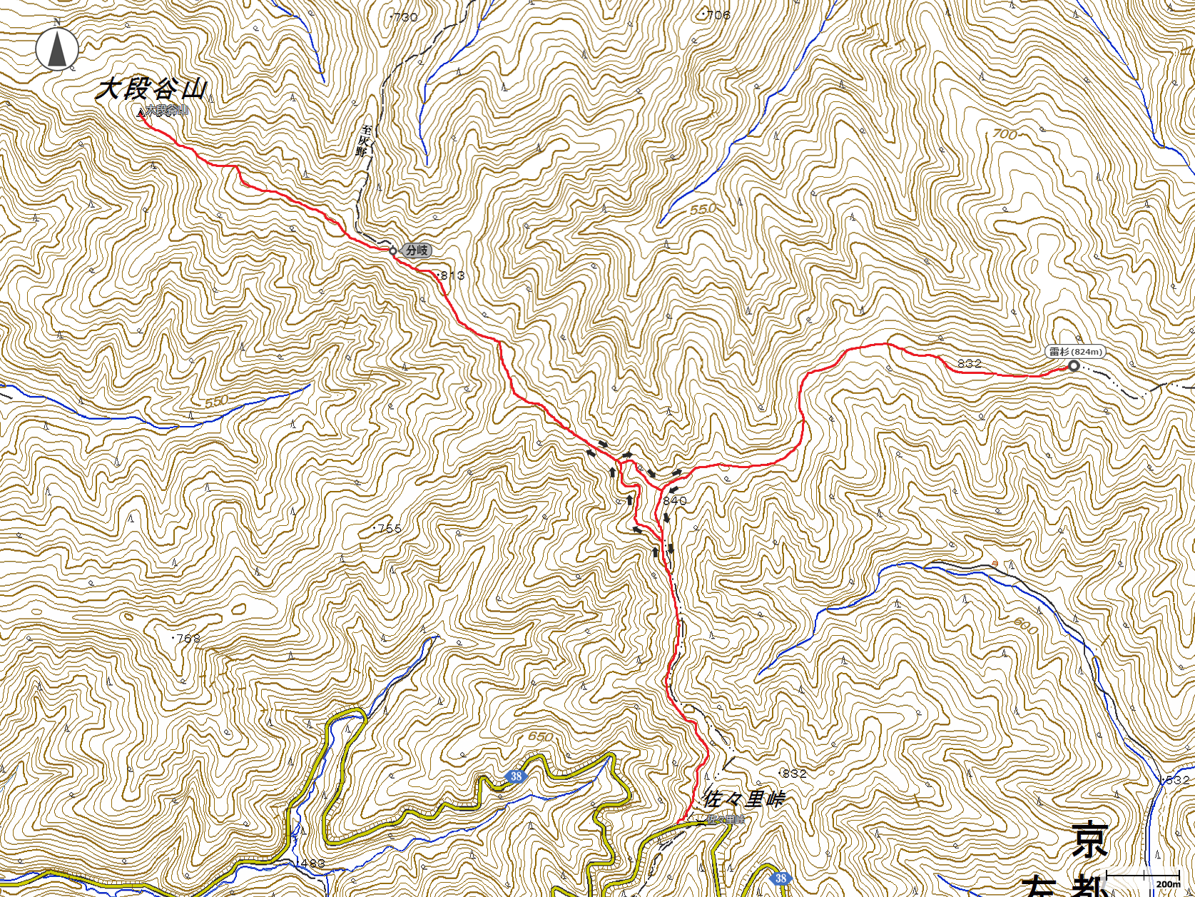 8:25佐々里峠→9:11分岐→9:36大段谷山→10:11分岐→11:14カミナリ杉