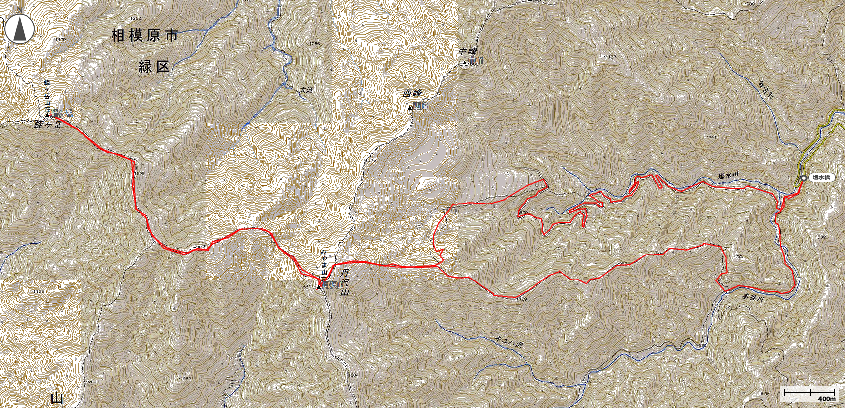 →12:42丹沢山頂→13:34天王寺尾根分岐→14:35塩水林道→15:08塩水橋