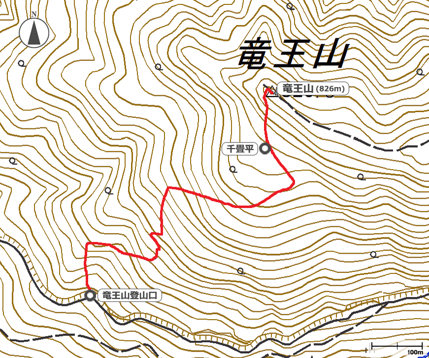 13:55竜王山登山口→14:20山頂まで500m地点→14:39千畳平
