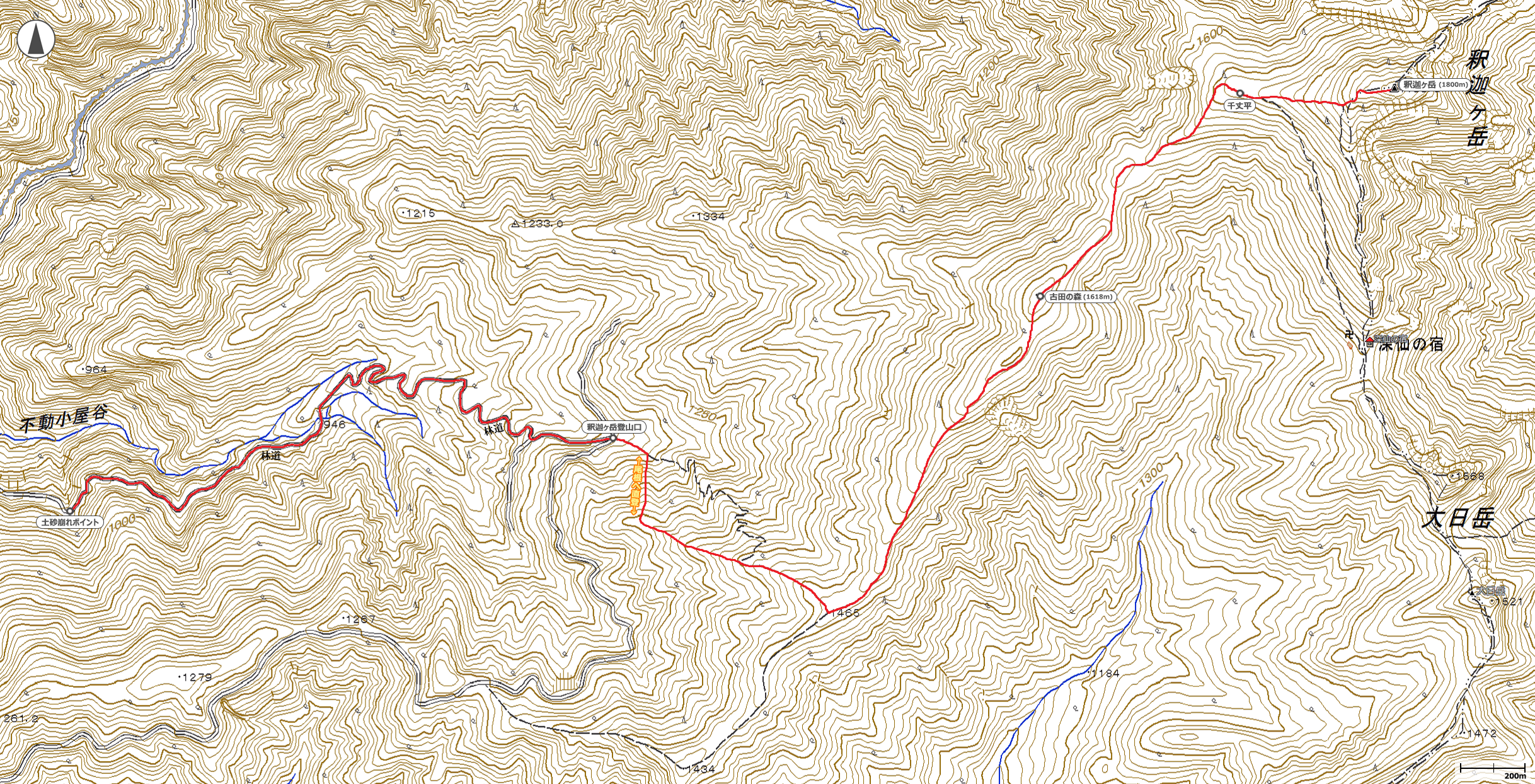 →15:02下山開始→16:55釈迦ヶ岳登山口→18:06林道崩壊場所