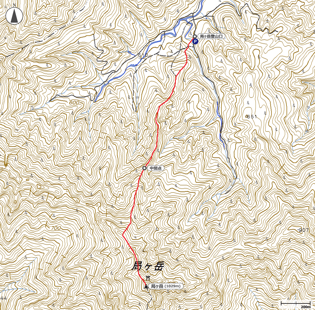 8:08駐車場・局ヶ岳登山口→8:49中間点→9:29十五町→9:49局ヶ岳