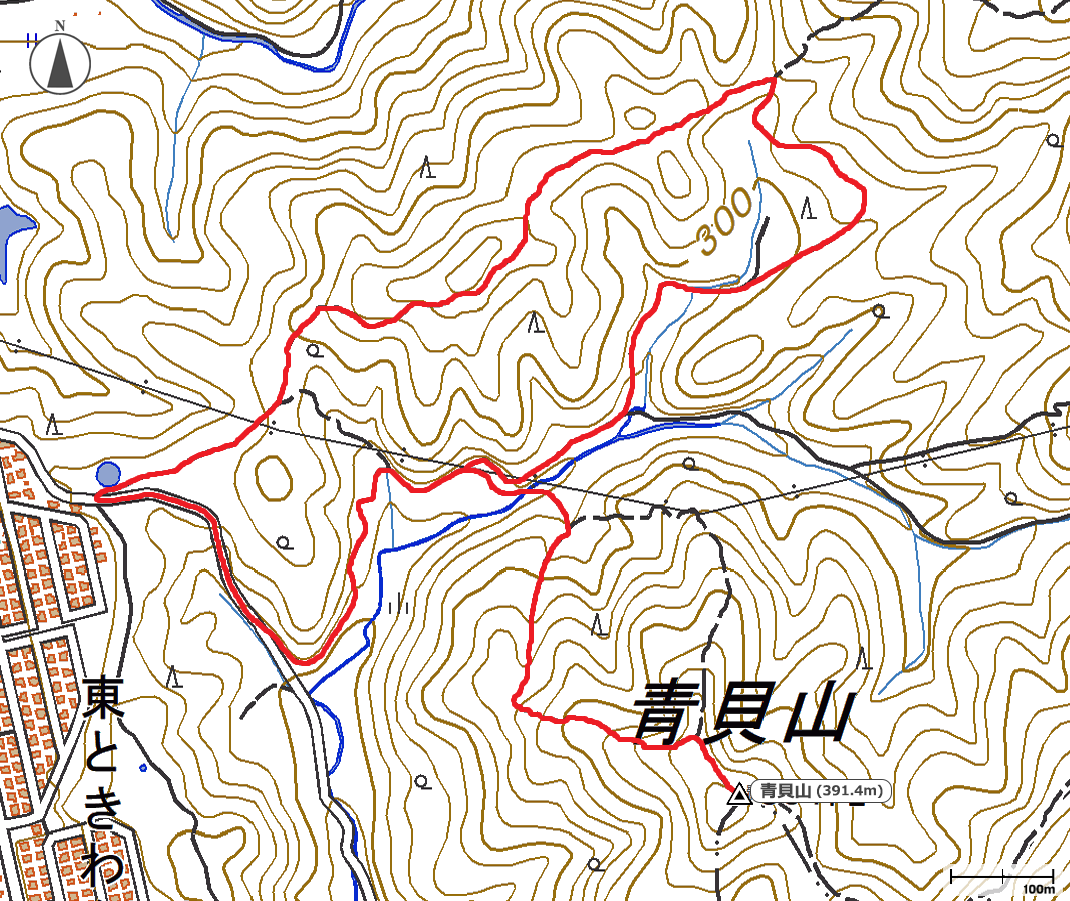 あまり人気がない山なのか道が整備されていないように思えます。西コースと東コースの分岐点が注意ポイントです。そこをよくみると割れた看板があります。右側の細いところを下るのが西コースです。橋を渡って沢筋を少し登ると、三叉路のようなところに出ます。右側は道らしくないですが、そのまま登り続けると黄色いテープが貼っている尾根に出ます。尾根に出て左側へさらに登っていくと青貝山山頂に着きます。今日のおかずは保温しておいた豚マンとチーズ、フランクパンです。今回はそのままピストンで西コース分岐点から今度は東コースへ登っていきました。しばらく登っていると、そのまま東コースで天台山へ向かうコースとときわ台(吉川峠)に戻れるコースの分岐点があるのでときわ台のほうへ戻ります。