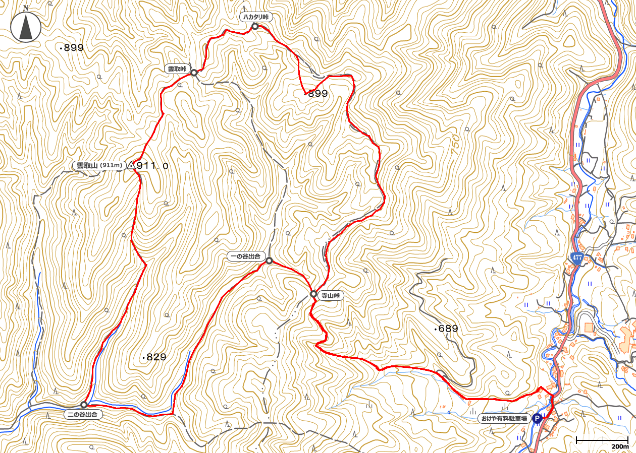 →12:15一の谷出合→12:23寺山峠→13:10おけや有料駐車場